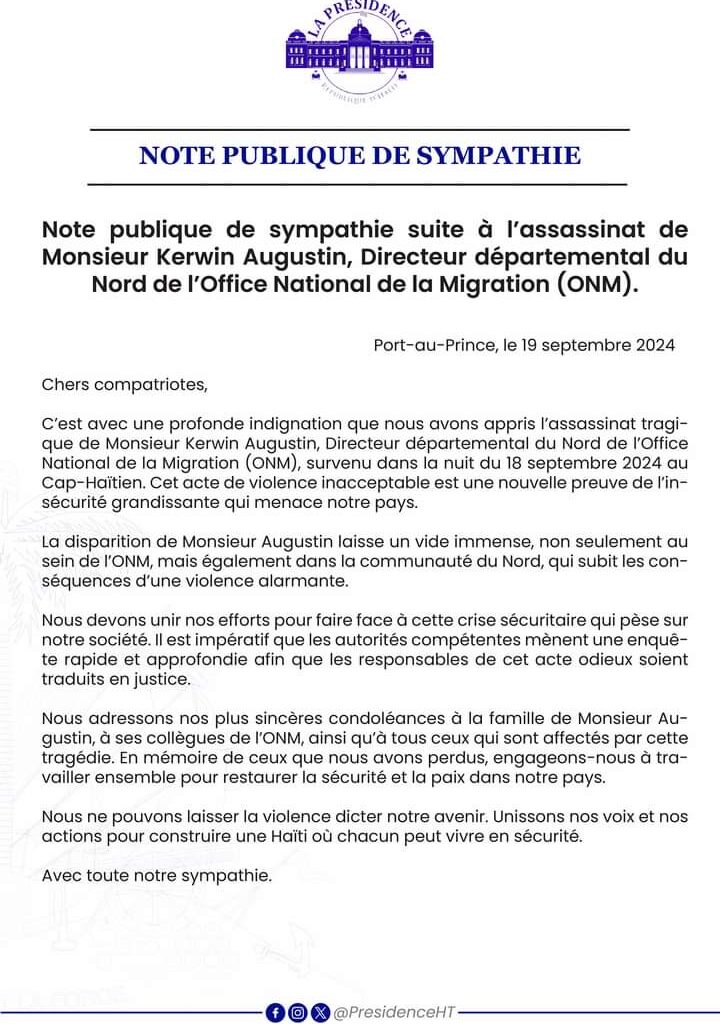COMMUNIQUÉ DE PRESSE DU 19 SEPTEMBRE 2024 19 septembre 2024 par Bureau de Communication de la Présidence Communiqués de presse Post Précédent COMMUNIQUÉ DE PRESSE DU 19 SEPTEMBRE 2024 Prochain Post Visite du Président kényan William Ruto en Haïti : un renforcement des relations bilatérales